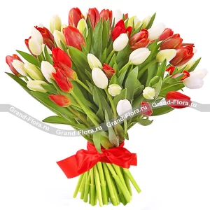 Всегда на высоте - букет из разноцветных тюльпанов с лентой