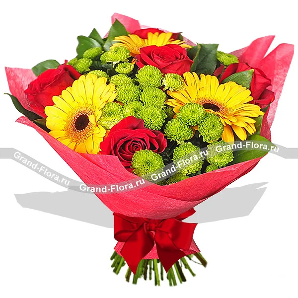 Буйство красок и романтическая нежность герберов, роз и хризантем делают этот букет ярким и запоминающимся. Зеленые хризантемы напоминают о чудесных весенних днях, желтые, как солнце герберы навевают мечты о лете, а красные розы, удачно вписанные в композицию, подводят завершающий итог. Этот великолепный дизайнерский шедевр понравится как молодой, так и замужней женщине.