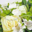 Уменьшенный: роза белая - 3 шт., эустома белая - 1 шт., альстромерия белая - 3 шт., хризантема кустовая зеленая - 2 шт., фетр зеленый.