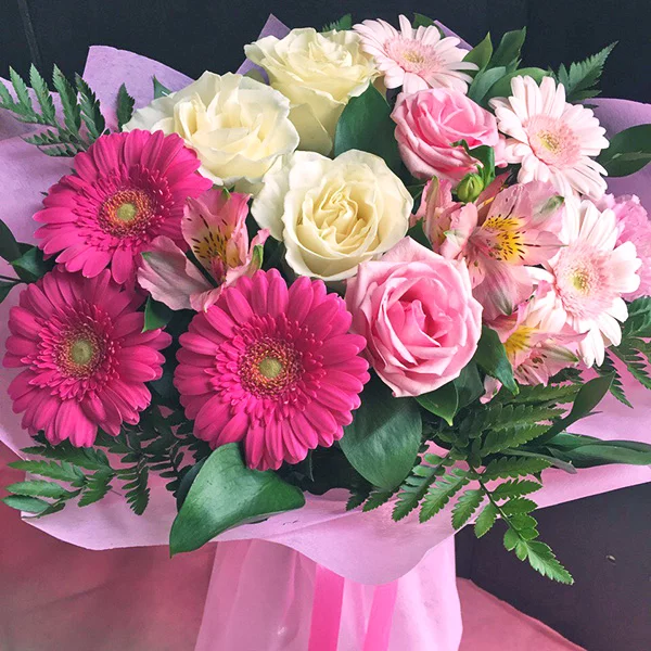 ДЕЛЮКС: роза белая - 4 шт., роза розовая - 5 шт., альстромерия розовая - 3 шт., гербера кремовая - 4 шт., кустовая роза розовая - 3 шт., лист аспидистра - 5 шт., упаковка розовая, лента розовая. Примерный размер: 45Х45 см.
