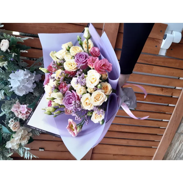 Чарующие и необыкновенные розы сиреневого и кремового оттенка, розовая эустома и фиолетовый лимониум в букете выглядят гармонично, роскошно и привлекательно.