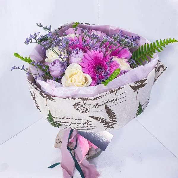 Уменьшенный: роза белая - 2 шт., гербера розовая - 3 шт., роза кустовая сиреневая (возможна замена на розовую) - 2 шт., декоративная зелень, упаковка, лента
