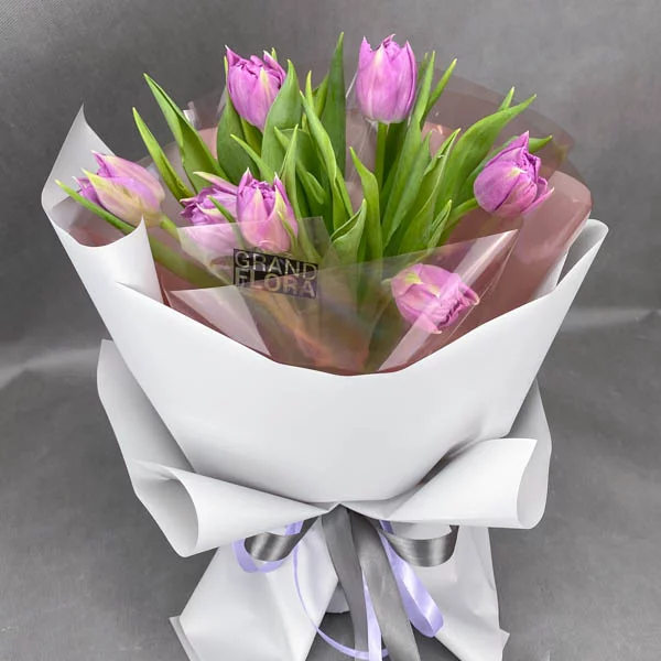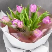 7 тюльпанов: тюльпаны розовые (розово-сиреневые) - 7 шт, упаковка, лента.