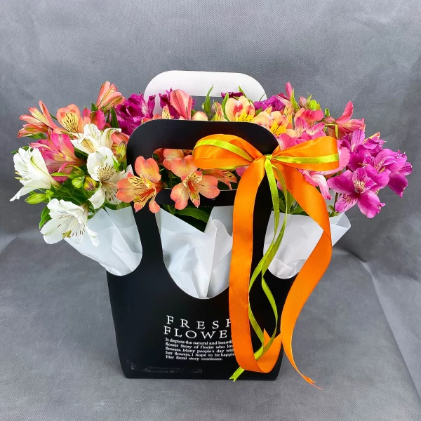 Разноцветные альстромерии представлены здесь в розовом и фиолетовом цвете.